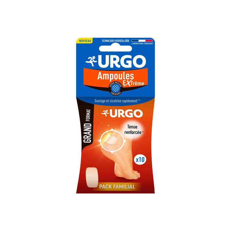 Conçu pour une tenue renforcée*, URGO Ampoule Extrême soulage la douleur. Le maillage en relief surépaissi réparti sur l’ensemble de ce pansement grand format isole les ampoules des pressions et des frottements. La masse hydrocolloïde du pansement forme un gel dermo-reconstituant qui favorise la cicatrisation de l’ampoule de grande taille. URGO Ampoule Extrême s’adapte de façon optimale à la forme du pied.