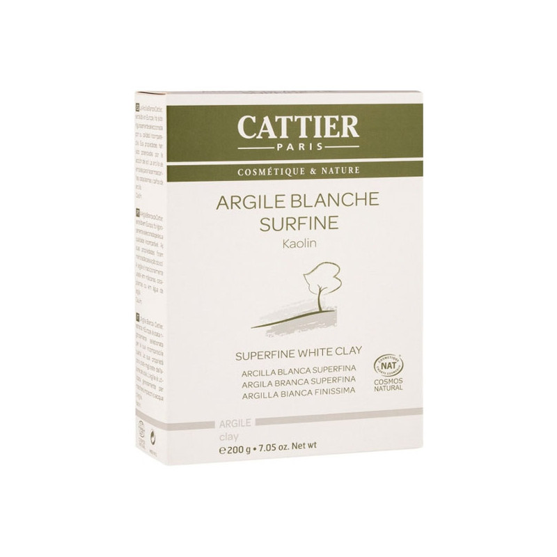 L’Argile blanche surfine Cattier, extraite dans le sud de l'Angleterre, a été rigoureusement sélectionnée pour son incomparable qualité. Elle est traditionnellement utilisée en masques ou en cataplasmes. Elle est transformée par des procédés mécaniques (concassage, broyage) et thermiques (séchage au soleil ou dans un four, autoclave...). Elle ne subit aucun traitement chimique et un contrôle rigoureux est fait sur chaque lot d'argile (couleur, aspect, granulométrie, microbio etc.).