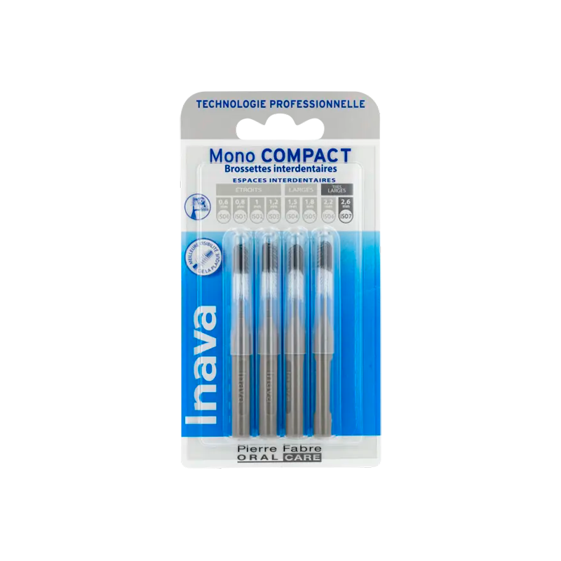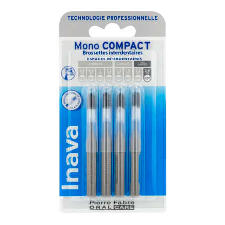 Conçues pour un nettoyage interdentaire efficace, les brossettes interdentaires Inava MonoCompact complètent les gestes d’hygiène bucco-dentaire quotidiens et sont particulièrement recommandées aux personnes porteuses d’implants, d’appareils orthodontiques ou dont les collets dentaires sont dénudés. Leur utilisation permet de réduire la formation de la plaque dentaire, responsable de caries et de gingivites, et consiste en une simple insertion délicate suivie de quelques va-et-vient.