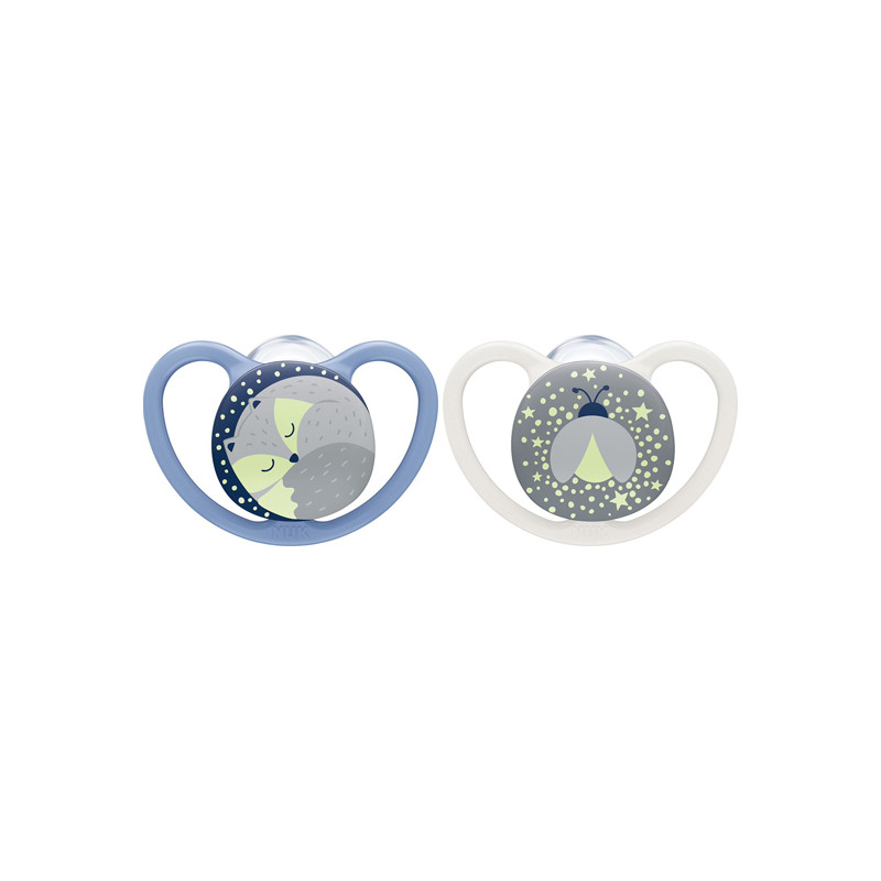 Les sucettes NUK Space Night aident les bébés à trouver facilement leur chemin vers le Pays des Rêves. Grâce à un matériau lumineux sans danger pour les bébés, les sucettes diffusent une douce lueur dans l'obscurité et peuvent être retrouvées rapidement et facilement, même la nuit.